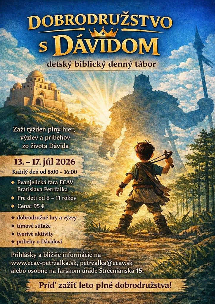 Pozývame všetky deti na nezabudnuteľný týždeň plný hier, výzviev a príbehov, nových priateľstiev a skvelej zábavy! Tento rok sa spoločne vydáme po stopách odvahy, viery a víťazstiev v rámci nášho denného tábora s názvom Dobrodružstvo s Dávidom.