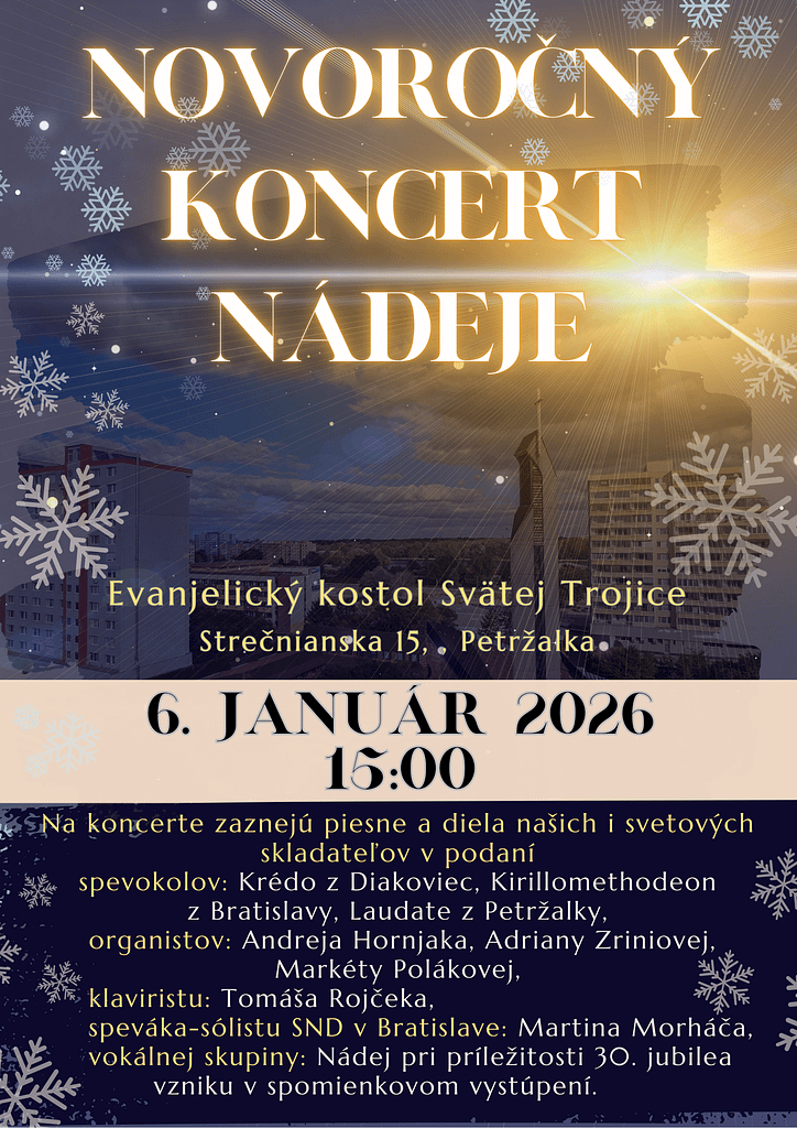Pozývame vás na slávnostný Novoročný koncert nádeje, ktorý sa uskutoční v atmosfére doznievajúcich vianočných sviatkov. Príďte si vychutnať diela slovenských aj svetových skladateľov v podaní výnimočných umelcov a telies.