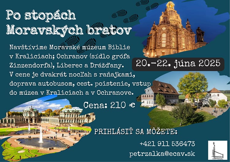 Pozývame Vás na zájazd „Po stopách Moravských bratov“. V dňoch 20. – 22. júna 2025 navštívime Moravské múzeum Biblie v Kraliciach, sídlo grófa Zinzendorfa v Ochranove, Liberec a Drážďany. V cene je nocľah na 2 noci aj s raňajkami, doprava autobusom, cestovné poistenie a vstupy do múzeí v Kraliciach a v Ochranove.